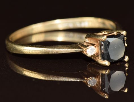 A 9ct gold ring set with a black diamond and further diamonds, 2g, size U