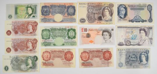 Thirteen Bank of England banknotes c.1940s to 2004 including L.K O'Brian £5, J.B Page £10 and two error notes, a D.H.F Somerset £20 with no serial numbers and a series E £10 note with ink from the obverse image prominent on the reverse