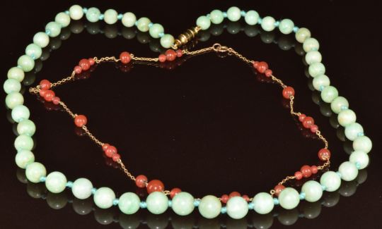 A single strand of graduated jadeite beads and a 9ct gold necklace with glass beads