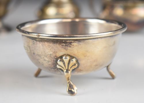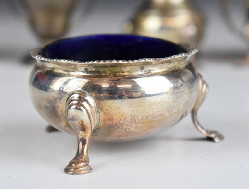 Hallmarked silver items comprising sauce boat, tea strainer on stand, salt, mustard, pepper and miniature twin handled trophy cup, weight without blue glass liner 328g