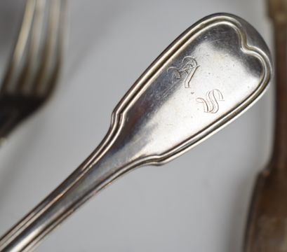 French silver cutlery comprising three table spoons, dinner fork and a serving scoop, all with Minerva head marks, length of longest 22cm, weight of all items 374g
