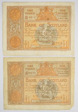 Bank of Scotland 1915 and 1922 £1 banknotes signed by P. Macdonald and A.J. Rose respectively