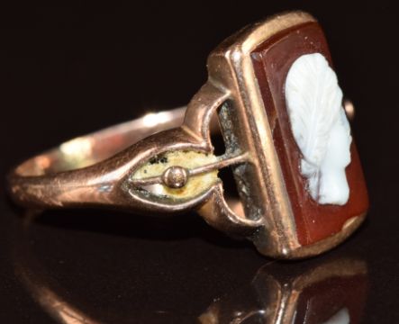 A 9ct rose gold ring set with an agate cameo, Birmingham 1912, 3.8g, size T