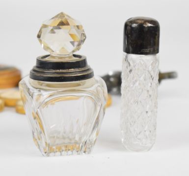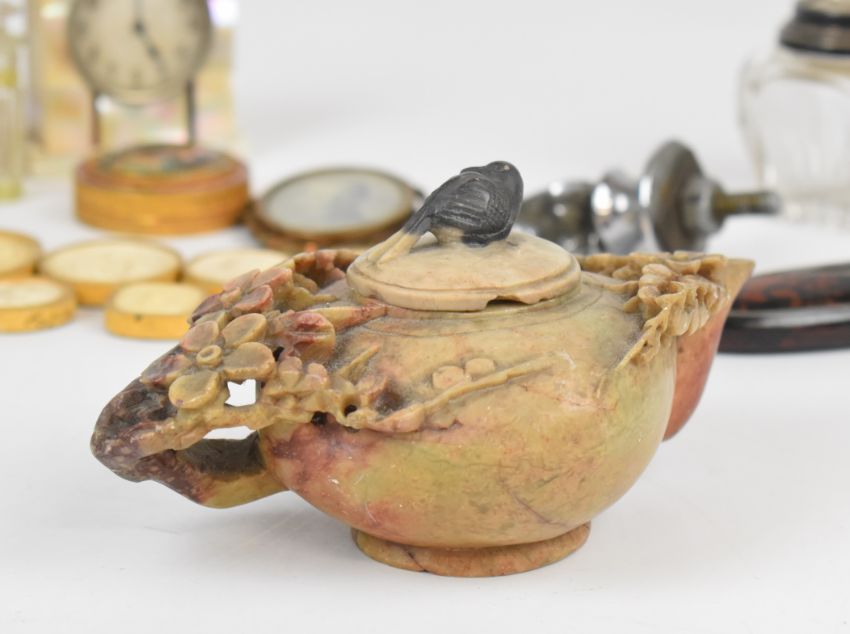 Chinese soapstone wine pourer with bird finial, squirrel car mascot, French ormolu two section powder pot with portrait decoration, hallmarked silver mounted pots, plaster Grand Tour style cameos etc.