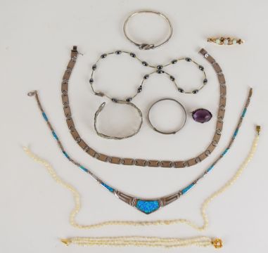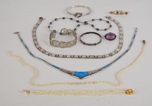 A collection of jewellery including two silver necklaces, silver bangle, 9ct gold brooch set with three opals etc.