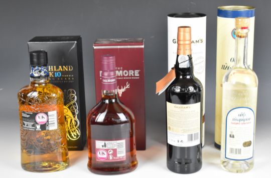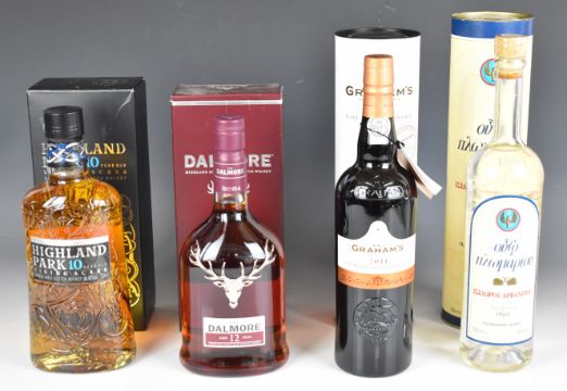 Single malt whisky comprising Dalmore aged 12 years 70cl 40% vol. and Highland Park 'Viking Scars' 10 year old 700ml 40%, 2011 Graham's Late Bottled Vintage Port 750ml 20% vol. and a bottle of Russian Vodka 700ml 40% vol., all either boxed or in presentation tubes.PLEASE NOTE ALL ALCOHOL & TOBACCO ITEMS ARE SUBJECT TO OVER 18 CHECK ON COLLECTION OR DELIVERY