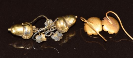 A pair of Victorian yellow metal earrings in the form of acorns and another pair of gilt earrings set with paste, 1.6g