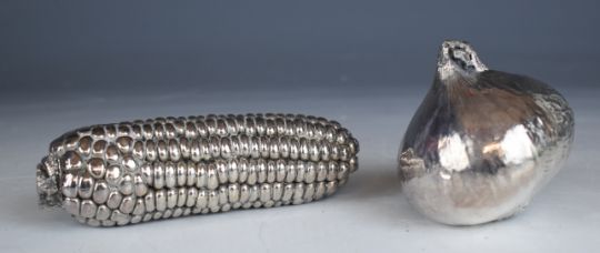 Elizabeth II novelty hallmarked silver paperweights formed as an onion and sweetcorn, Birmingham 1998, maker John Bull Ltd, weight of both 527g (filled)