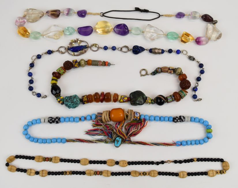 Five beaded necklaces including silver and lapis lazuli, glass with Navajo pendant, quartz necklace, a glass and turquoise and a scarab beetle necklace
