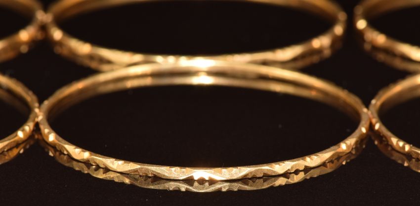 Six yellow metal bangles from Bahrain (tests as 20-22ct), 26.2g, 4.8cm