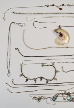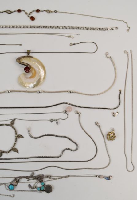 Eighteen silver necklaces including rose quartz, pressed amber, locket, shell, etc, 172g