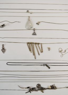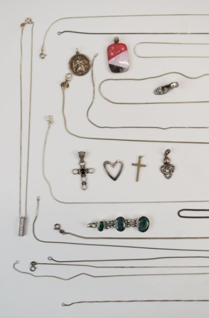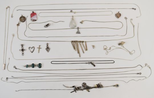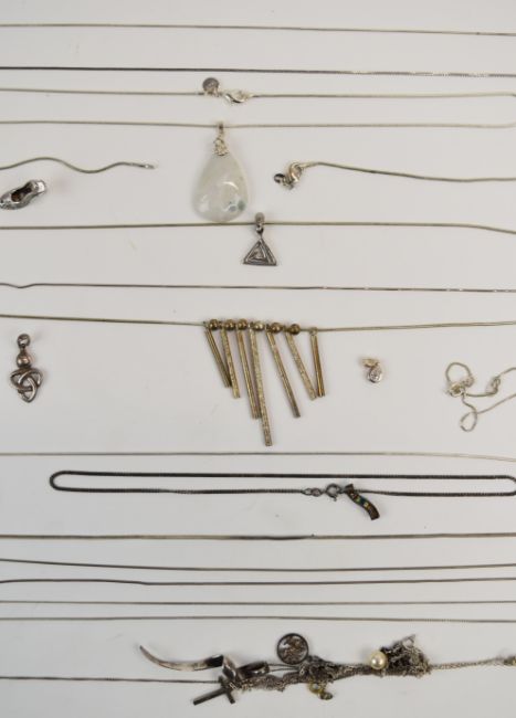 Sixteen silver pendants and sixteen silver chains and a silver necklace, 125g