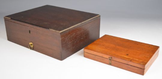 Two 19thC artist's watercolour boxes comprising Rowney example with three ceramic mixing dishes, one being a Newman example, glass or similar mixing dish, Newman's named watercolour paint blocks and drawer below housing wooden and ceramic palettes, the latter named Newman, width of larger 23cm