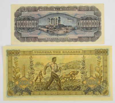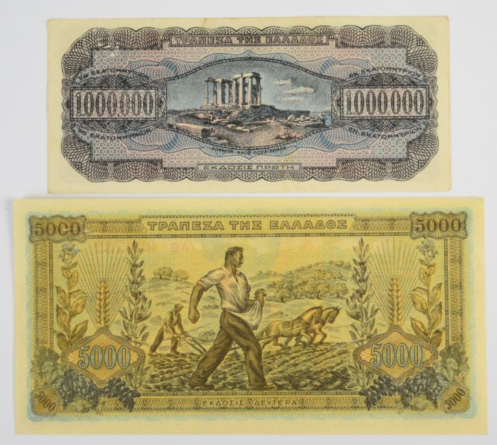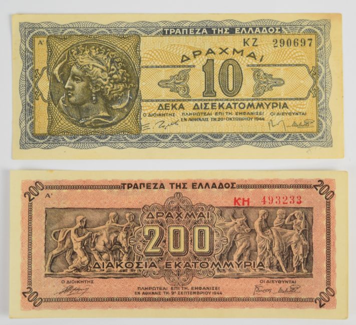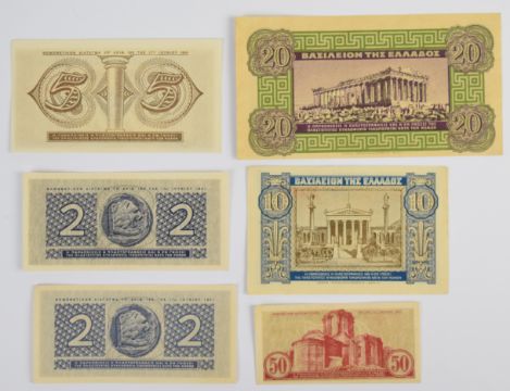 Twenty five Greece WW2 banknotes including 1940, 1941 low-denomination and hyperinflation notes