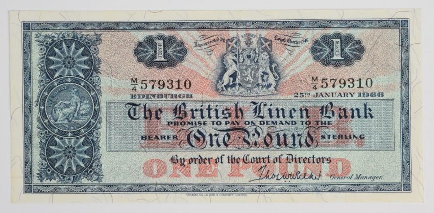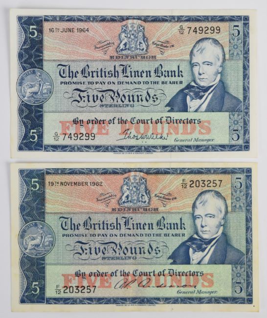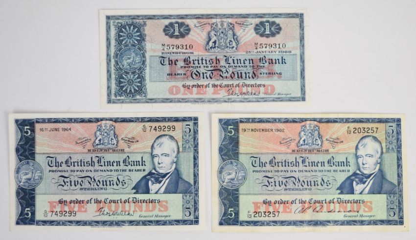 Three Scotland British Linen Bank £1 and £5 banknotes, 1962-66, the two £5 notes signed by A.P. Anderson (1962) and T.W. Walker (1964)