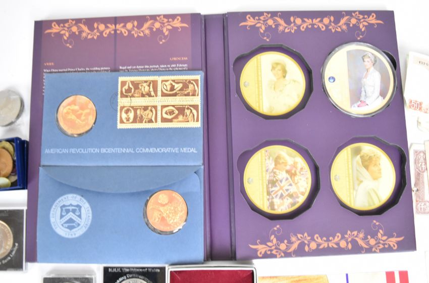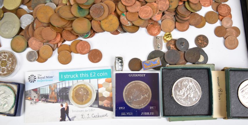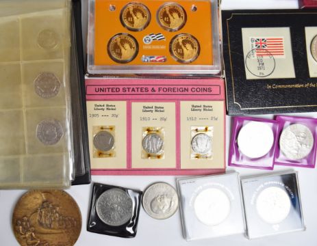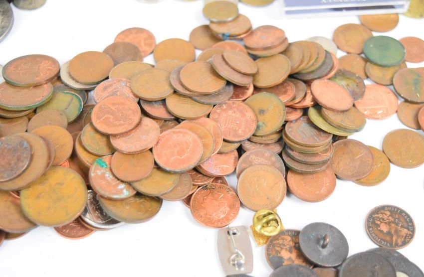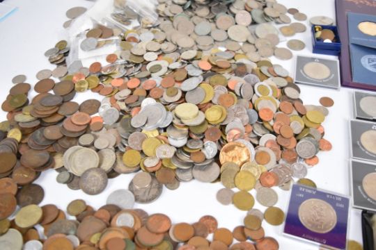 A large quantity of pre-decimal and decimal British coinage plus world coins and over fifty banknotes, including Canada, Belgium, Eire, France, Italy, Netherlands, Spain and USA etc. Silver coin content includes six USA commemorative coins in folder packs, including Thomas Jefferson 1993 currency set, Inauguration of US postal service 1971, The Freedom pack 1993