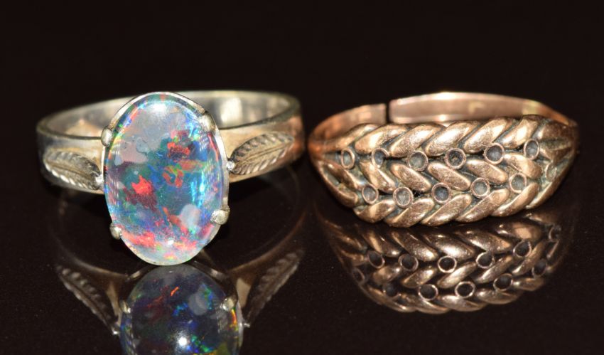 A 9k white gold ring set with an opal triplet and a 9ct gold keeper ring (both damaged), 5.4g