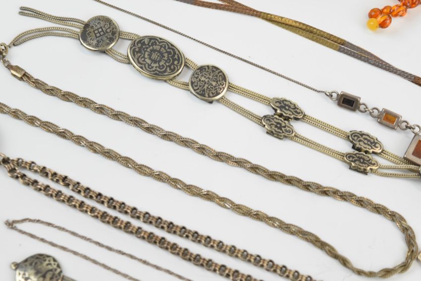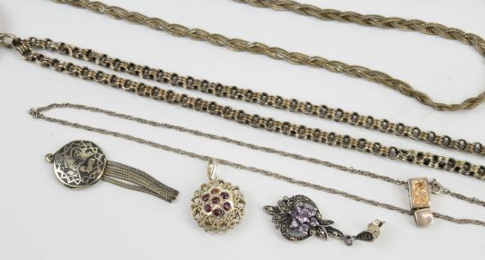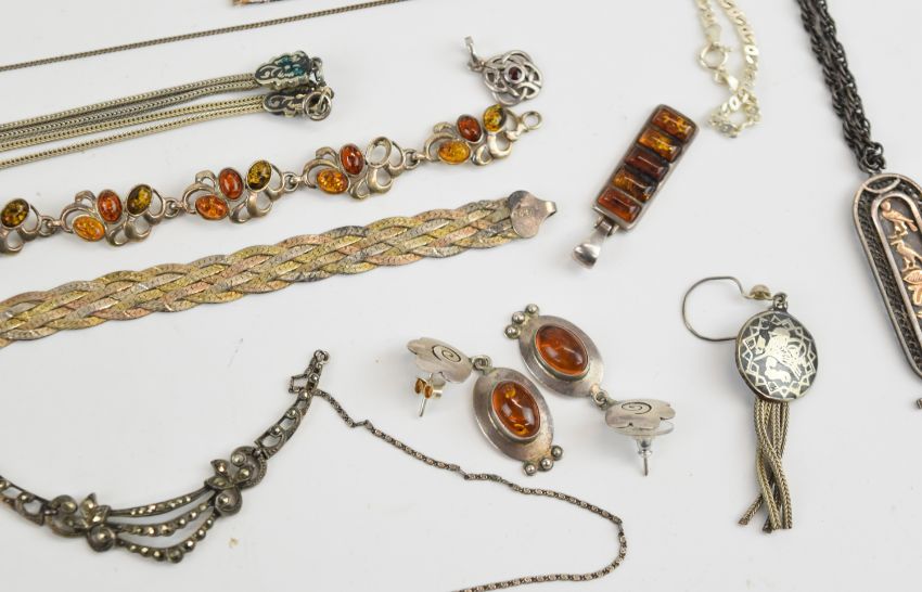 An amber necklace and matching bracelet, three strand amber necklace, bi-coloured silver necklace and matching bracelet, silver items including two pairs of earrings, six chains, Egyptian pendant, four further pendants, two bracelets, Victorian locket and chain and a pocket watch, and a white metal necklace and earrings