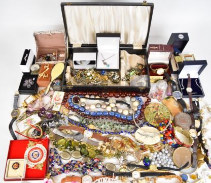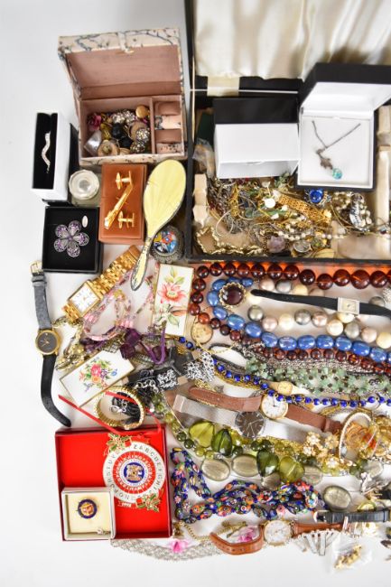 A collection of jewellery including Exquisite necklace, Jewelcraft bracelet, Rotary watches and Sekonda watches, Hollywood brooch, millefiori beads, Vogue compact, etc