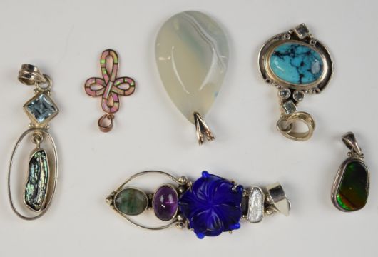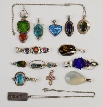 Fourteen silver pendants including turquoise, amethyst, pressed amber, etc