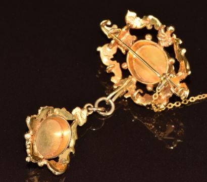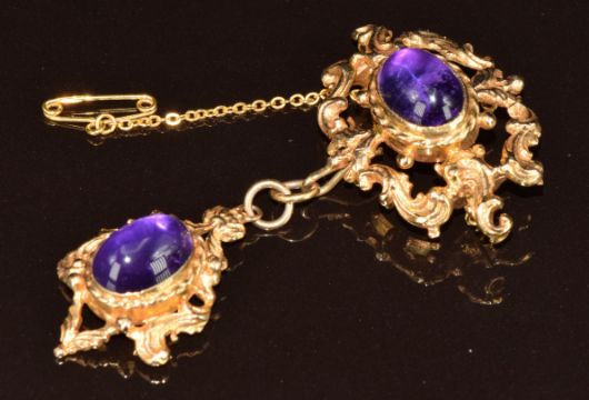 A 9ct gold brooch set with two amethyst cabochons, 17.3g, 7cm
