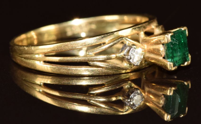 An 18ct gold ring set with an emerald cut emerald of approximately 0.45ct and two diamonds, 3.7g, size S