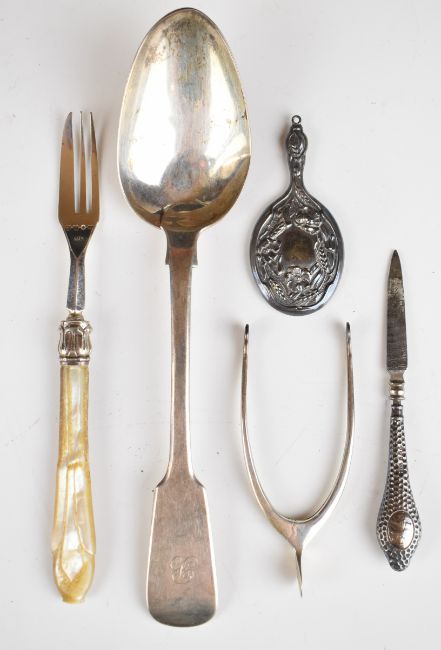 Hallmarked silver items comprising hand mirror, novelty miniature mirror, three brushes, fiddle pattern table spoon, butter knife, sifter ladle, novelty wishbone sugar nips, heart shaped trinket box, cut glass silver lidded dressing table bottle, mother of pearl handled fork, two silver handled items, pair of candlesticks and a cased set of coffee bean spoons, 162 g all in of weighable silver including coffee bean spoons