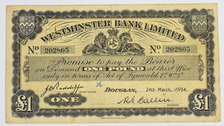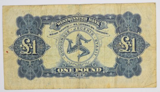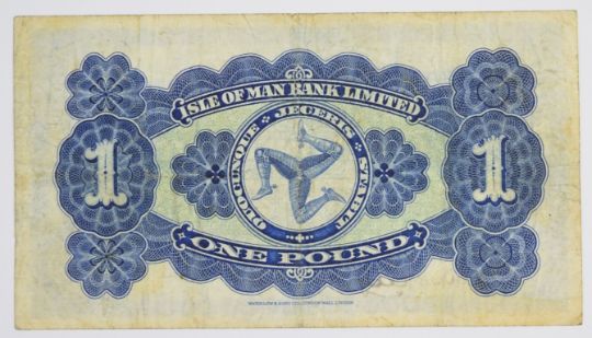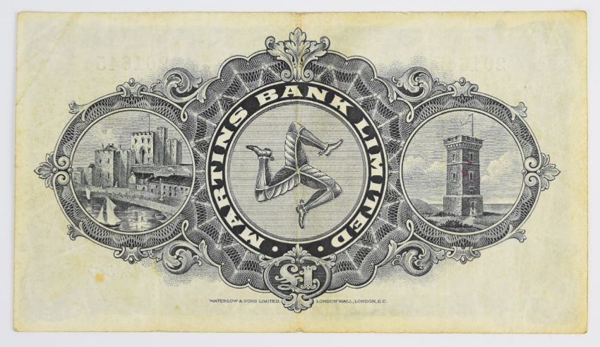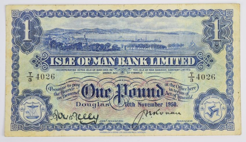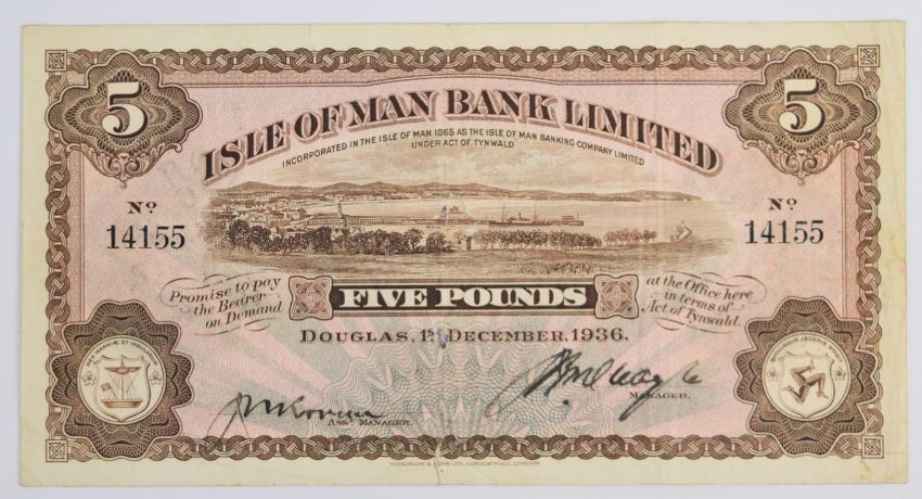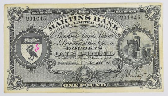 Four Isle of Man pre-1961 banknotes including 1936 Isle of Man Bank £5 and 1950 Martins Bank £1