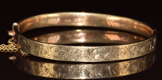 A 9ct gold bangle with engraved scrolling decoration, 9.1g, 5.3 x 6cm