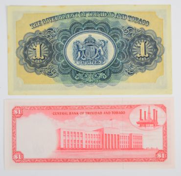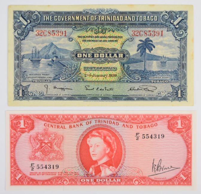 Two Trinidad & Tobago $1 banknotes, one dated 1939 the other undated but featuring a young Queen Elizabeth II and signed V.E. Bruce (Victor Bruce, Governor of the Central Bank of Trinidad & Tobago from 1969)