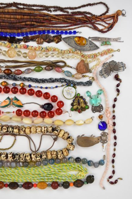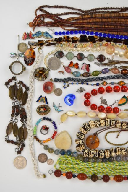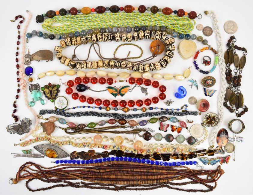 A collection of jewellery including 800 grade silver filigree butterfly brooch, other brooches including silver butterfly set with enamel, vintage enamel butterfly examples, micro mosaic, Miracle and 'in search of paradise' silver example, coins, beaded agate, glass and mother of pearl beaded necklaces and an inlaid tortoiseshell pendant, some made by local Stroud artist Veronica / Ronnie Robertson etc From the private collection of Veronica / Ronnie Robertson who was in a relationship with Kit Williams c1979