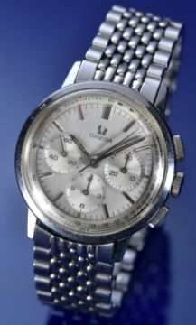 Omega gentleman's chronograph wristwatch with steel hands and baton hour markers, silver dial and stainless steel case, on stainless steel bracelet, case diameter 35mm.
