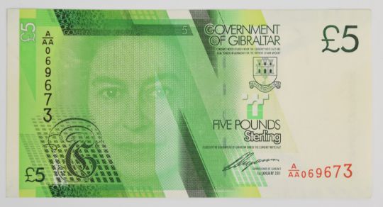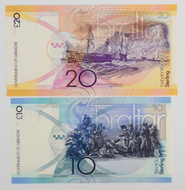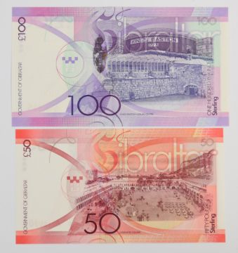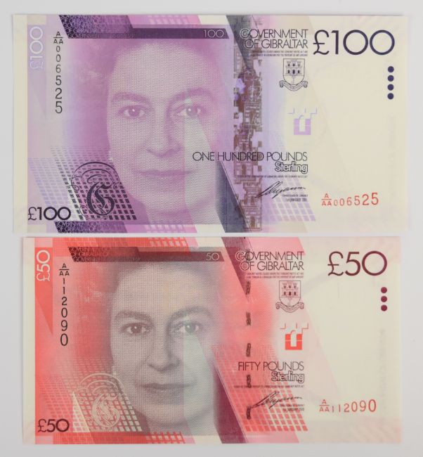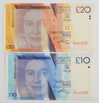Five Gibraltar 2010 issue banknotes comprising £5, £10, £20, £50 and £100