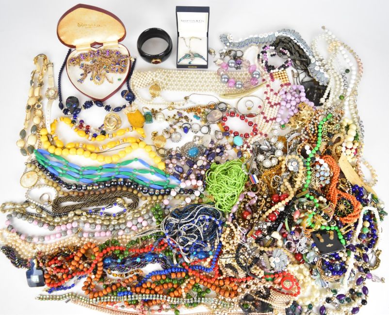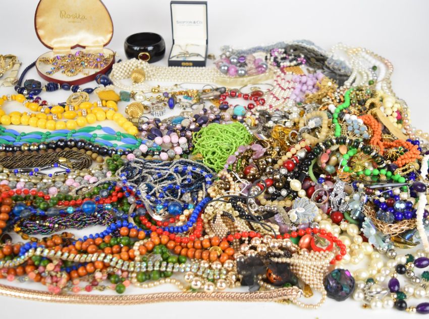 A collection of jewellery including ten silver rings, two 9ct gold rings (3g), beaded necklaces, vintage brooches including Ciro, silver brooch / pendant, silver locket, etc