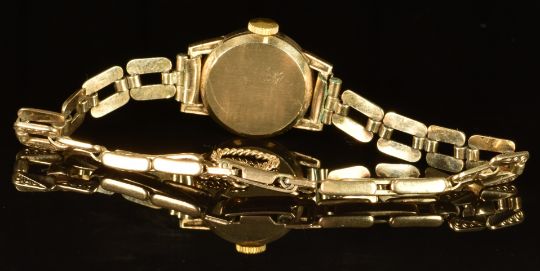 Sekonda 9ct gold ladies wristwatch with black hands and Arabic numerals, silver dial and 17 jewel movement, on 9ct gold bracelet, case diameter 17mm, 14.5g.