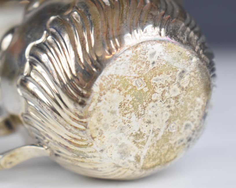 Elizabeth II hallmarked silver sauce boat with shaped edge, scroll handle and three plain feet, Sheffield 1959, maker Viner's Ltd, length 14.5cm, Victorian hallmarked silver jug with embossed decoration and two hallmarked silver napkin rings, weight of all items 177g