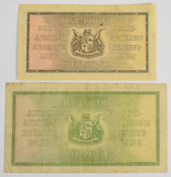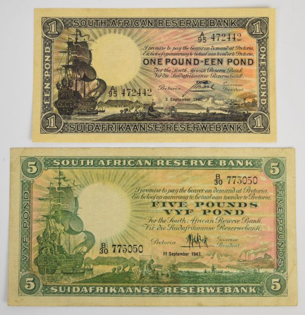 Two South Africa 1940s banknotes comprising a 1947 £5 and a 1940 £1 note