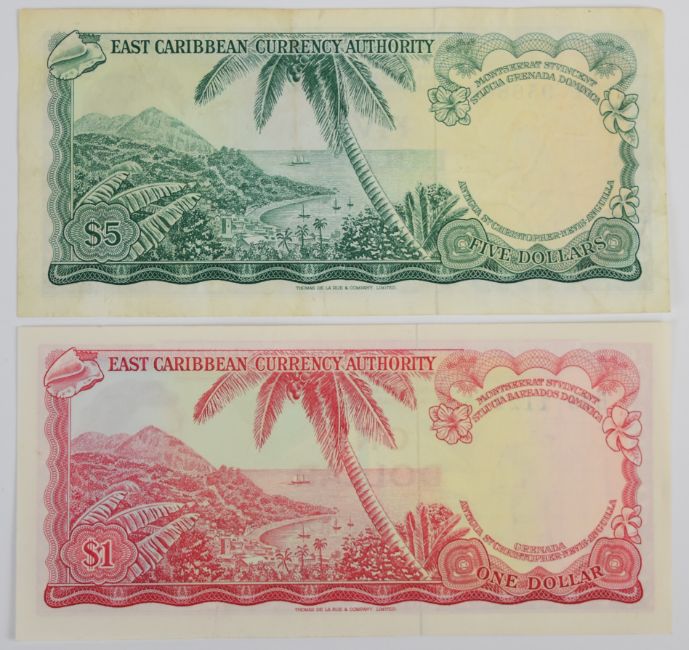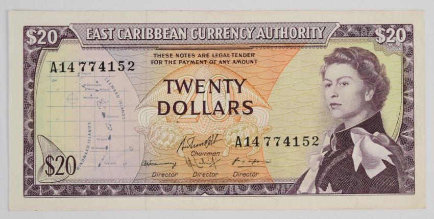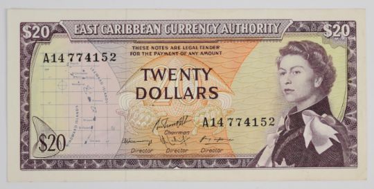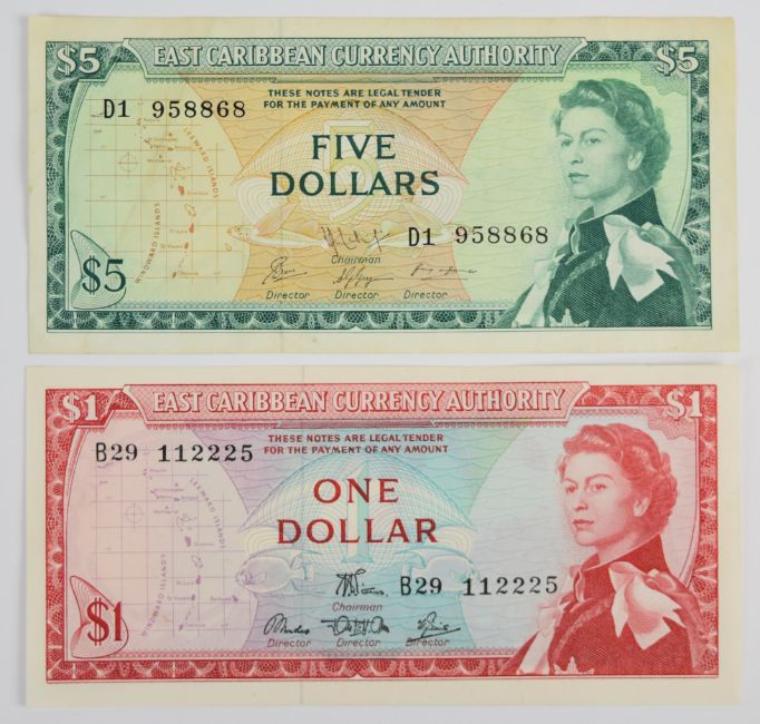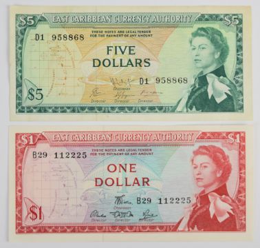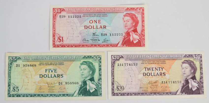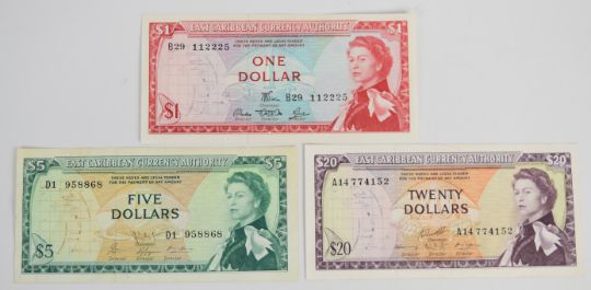 Three East Caribbean States 1965 issue banknotes including $1, $5 and $20