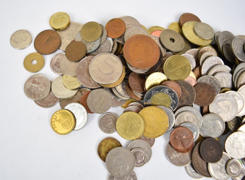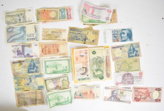 19th / 20thC collection of world coinage, some silver content, highlight includes Victoria halfpenny 1900 with lustre, tokens including Prince of Wales Hotel, Cheltenham and Bell Inn, Frampton on Severn together with a collection of banknotes including Chis Salmon £10, Central Bank of Ireland £20 and thirty three £1 notes including Jo Page, Fforde and Hollam