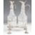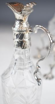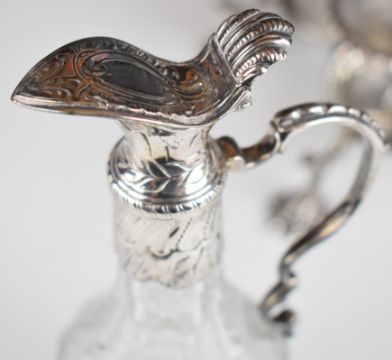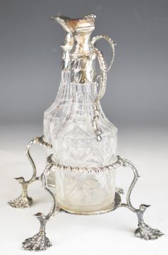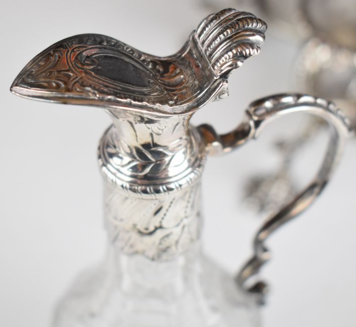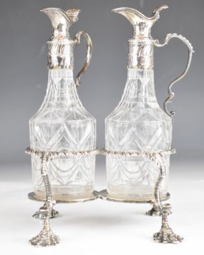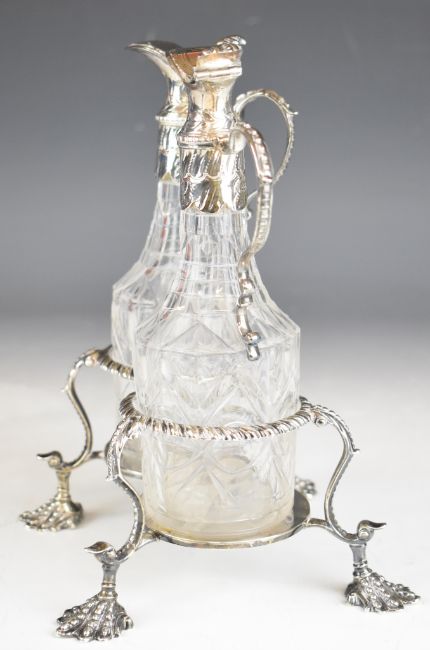 Georgian hallmarked silver and cut glass two bottle cruet, the stand with gadrooned edge and raised on ornate feet, London 1768, maker Robert Peaston, height 22cm