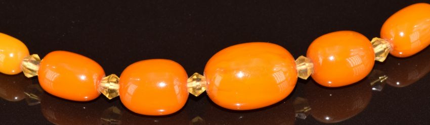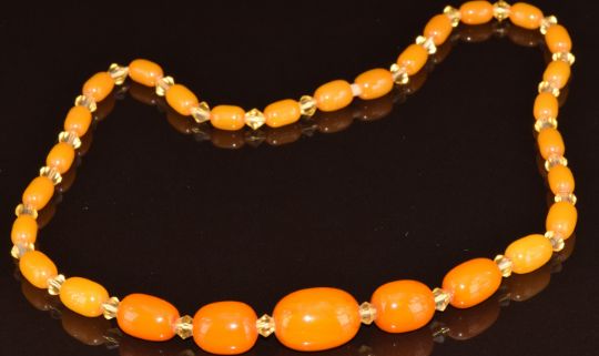 A graduated amber necklace interspersed with paste beads, largest amber bead 13.6 x 18.6mm, 16.2g