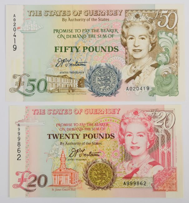 Four Guernsey 1994-96 issue banknotes signed by D.P. Trestain, including £5 and £10 with very low serial numbers