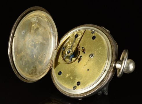Unnamed silver keyless winding open faced chronograph pocket watch with gold hands, black Roman numerals, white dial and unsigned movement, case diameter 55mm, serial number 94669.
