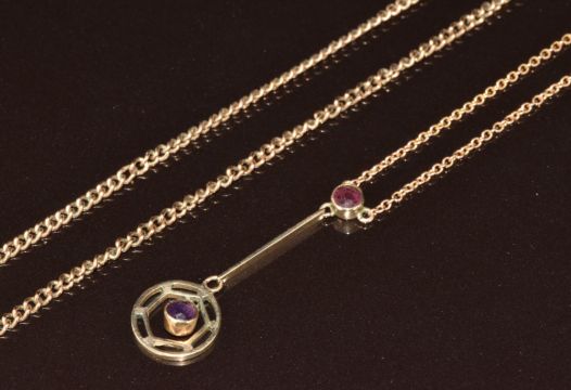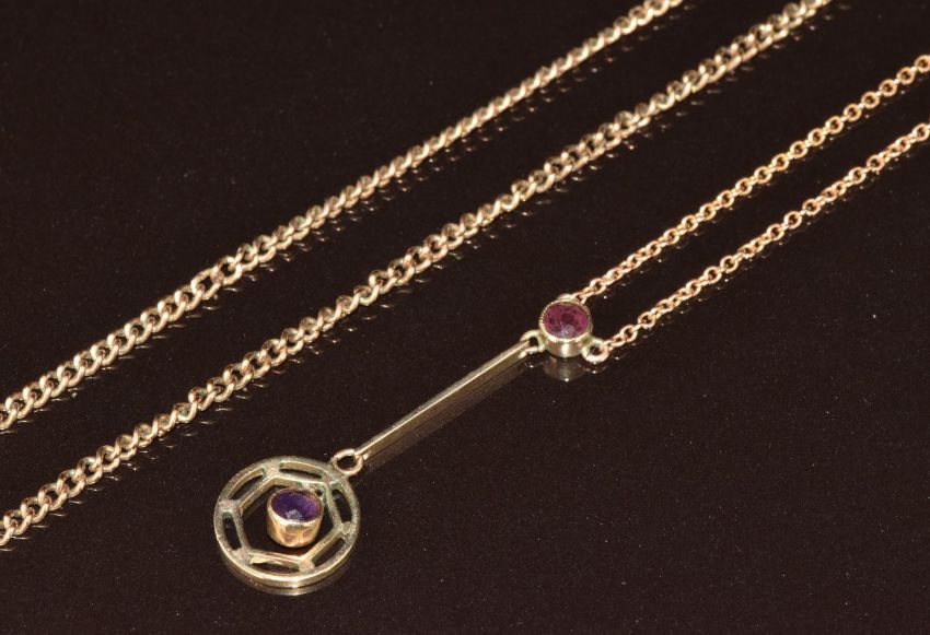 Edwardian 9ct gold necklace set with amethysts and a 9ct rose gold chain, 8.6g, 40 & 44cm