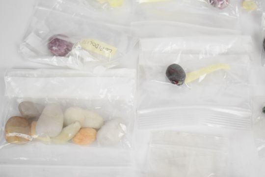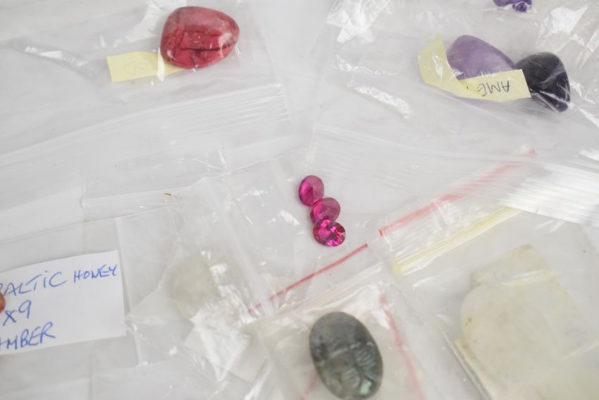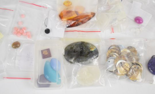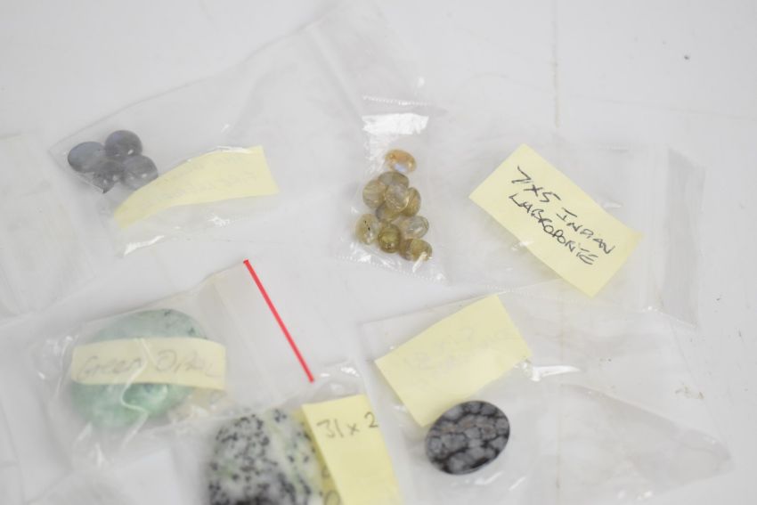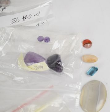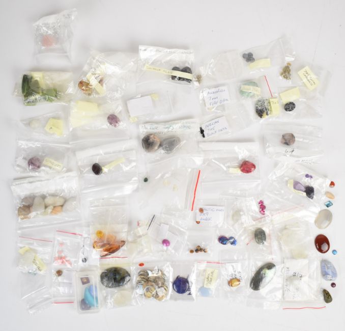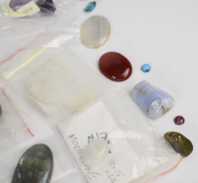 A collection of loose gemstones including agate, howlite, onyx, labradorite, amber, onyx and tiger's eye cabochons, amethyst, amber, etc