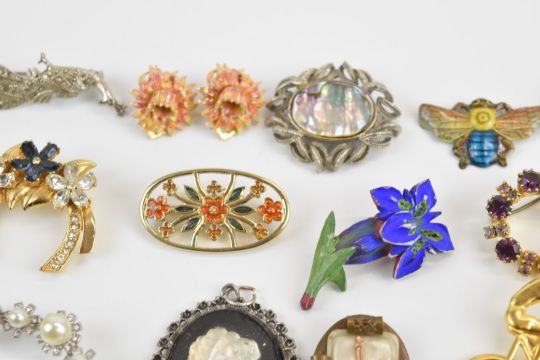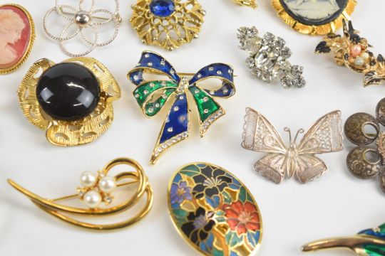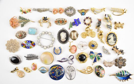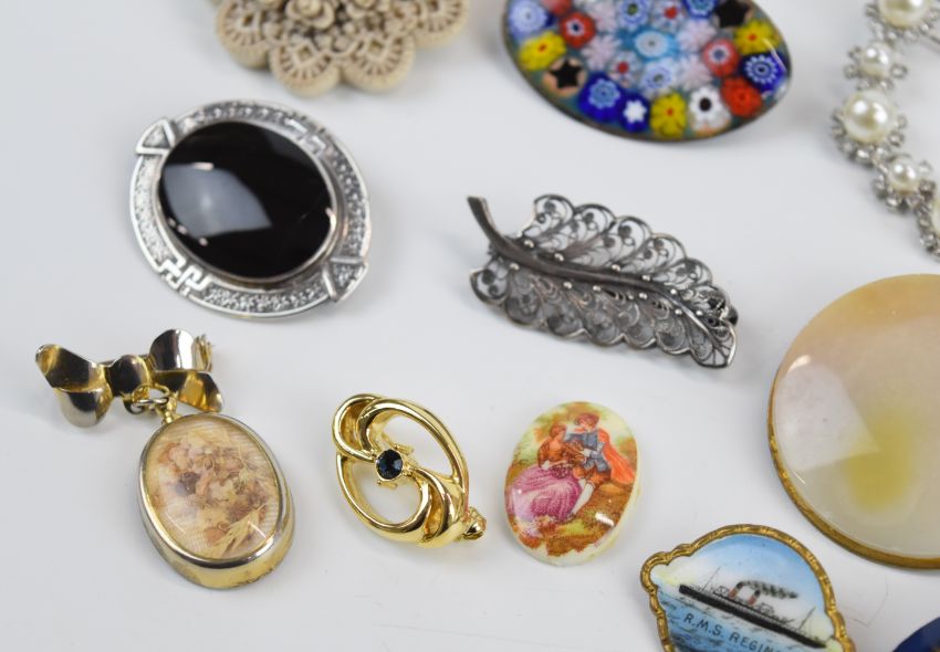 A collection of vintage brooches including agate, two silver filigree, silver set with onyx, enamel R.M.S Regina, Monet, Satara, etc