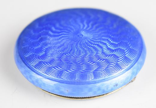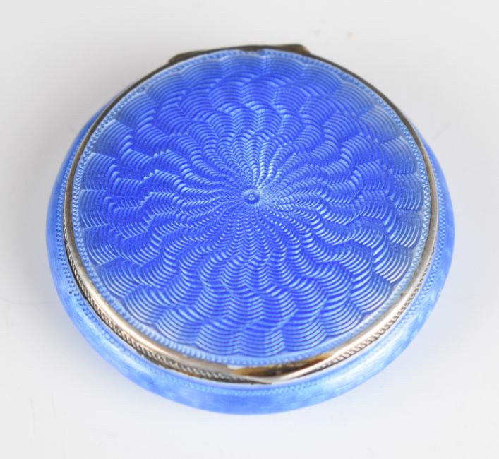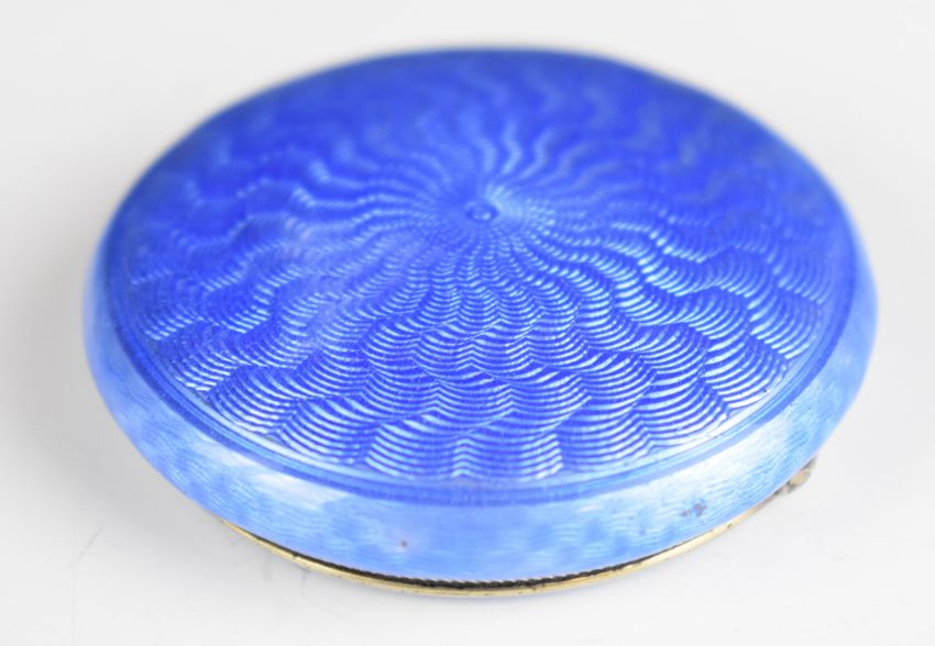Art Deco hallmarked silver and blue guilloché enamel compact, Birmingham 1931, maker Adie Brothers Ltd, diameter 5cm