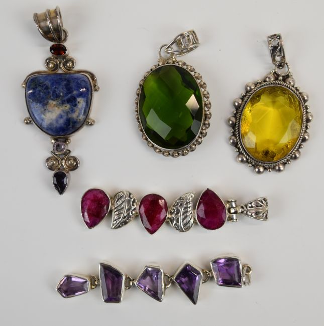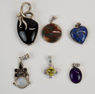 Sixteen silver pendants set with sodalite, moss agate, amethyst, etc