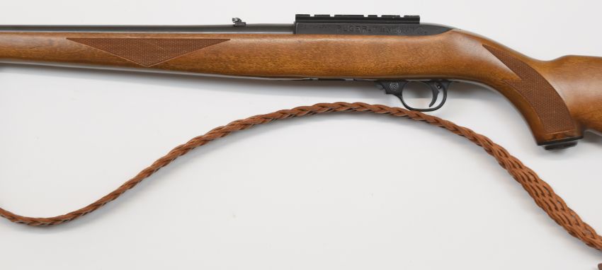 Ruger Model 10/22 .22 semi-automatic rifle with chequered semi-pistol grip, braided leather sling, adjustable sights, scope rail, multi-shot magazine, sound moderator and 24 inch barrel, overall length 108.5cm, serial number 247-41942. PLEASE NOTE THAT A VALID RELEVANT FIRARMS CERTIFICATE IS REQUIRED TO VIEW OR PURCHASE THIS LOT AND FOR ALL SHOTGUNS OR RIFLES PLEASE ENSURE YOU HAVE THE RELEVANT CERTIFICATE BEFORE BIDDING.
