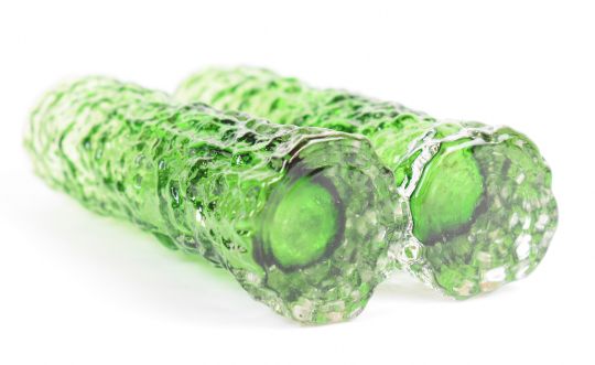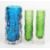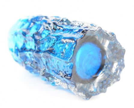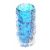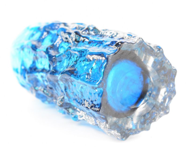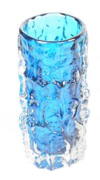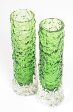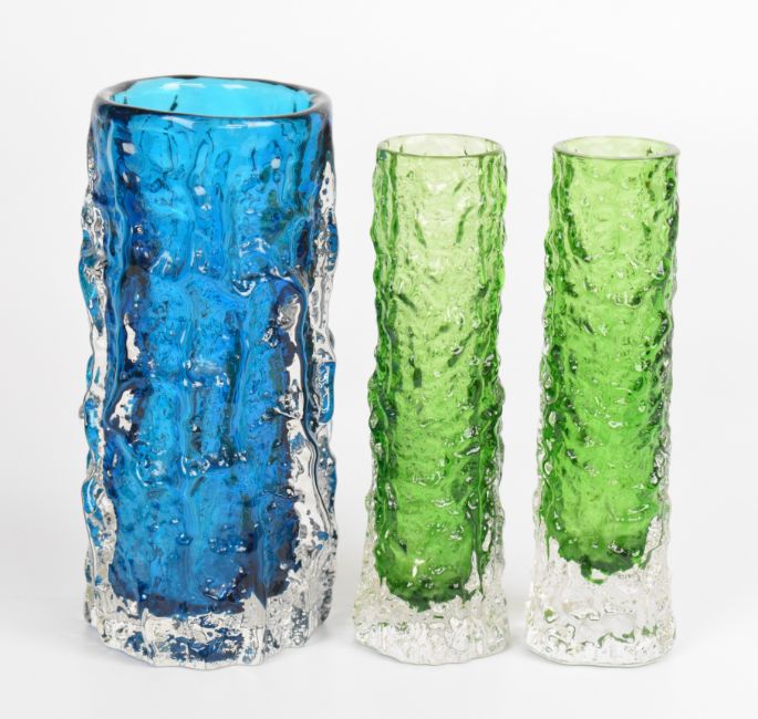 Three Geoffrey Baxter for Whitefriars textured bark glass vases of cylindrical form, a pair in moss green and one in kingfisher blue, largest 15.5cm tall.